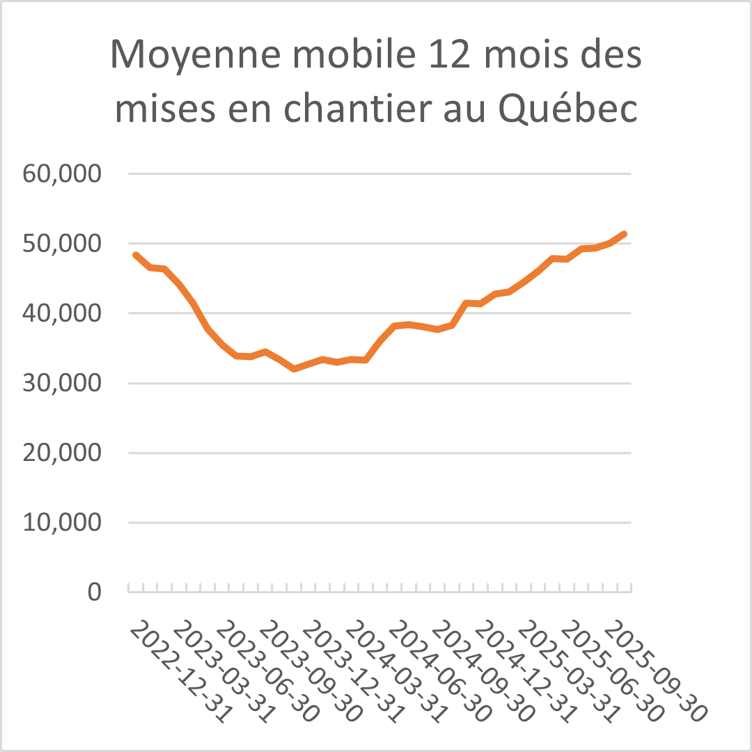 Quand j’analyse les mises en chantier, j’utilise une moyenne mobile des 12 derniers mois. Autrement dit, pour la donnée d’août 2025, j’utilise le total des mises en chantier pour la période de septembre 2024 à août 2025. Pour la donnée de septembre 2025, j’utilise le total des mises en chantier pour la période d’octobre 2024 à septembre 2025. Et ainsi de suite.