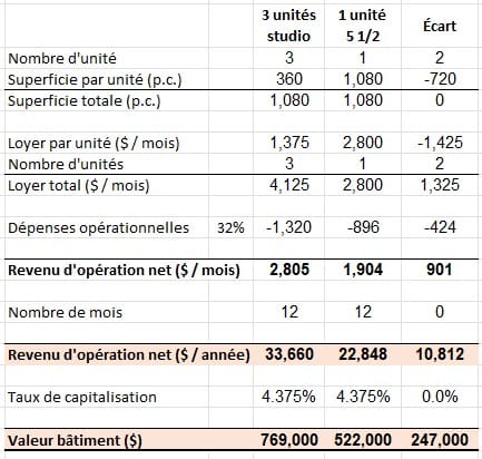 Autrement dit, pour la même superficie de 1080 p.c., je peux avoir une unité de 3 chambres et collecter 2800 $ mensuellement. Ou diviser ce 1080 p.c. en 3 unités studios et toucher 3 x 1375 $ = 4125 $ par mois.