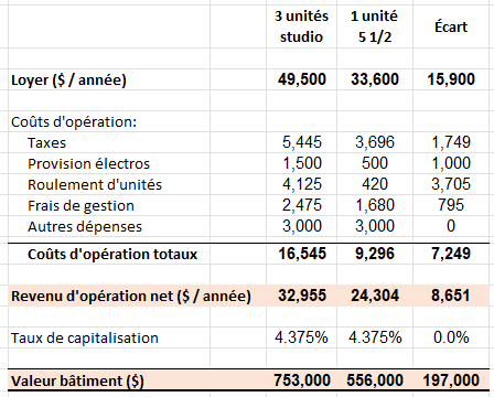 Autrement dit, pour la même superficie construite, 3 studios auraient une valeur de 769K$, contre 522K$ si l'espace était plutôt dédié à une seule unité. Une différence de valeur de 47% en faveur des petites unités.