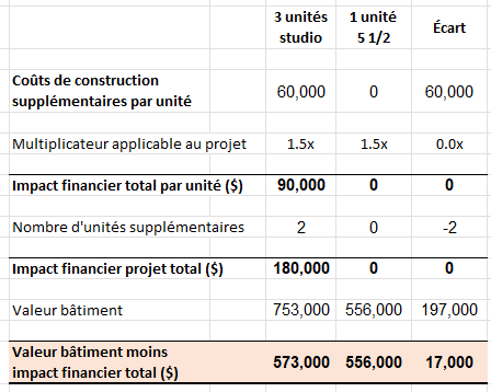 Pour la même superficie construite, 3 studios affichaient donc une valeur de revente projetée supérieure de 247K$ à celle d'un 5 1/2. Une différence de valeur de 47% en faveur des petites unités.
