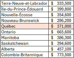 La valeur médiane des ménages québécois est de 371 000 $, ce qui est inférieur à la médiane canadienne. L'Ontario et la Colombie-Britannique sont en tête de file.